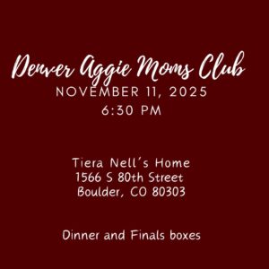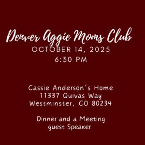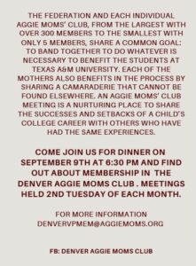 Come join us for dinner on September 9th at 6:30 pm and find out about membership in the Denver aggie moms club. Meetings held 2nd Tuesday of each month.